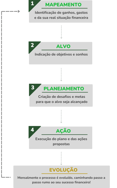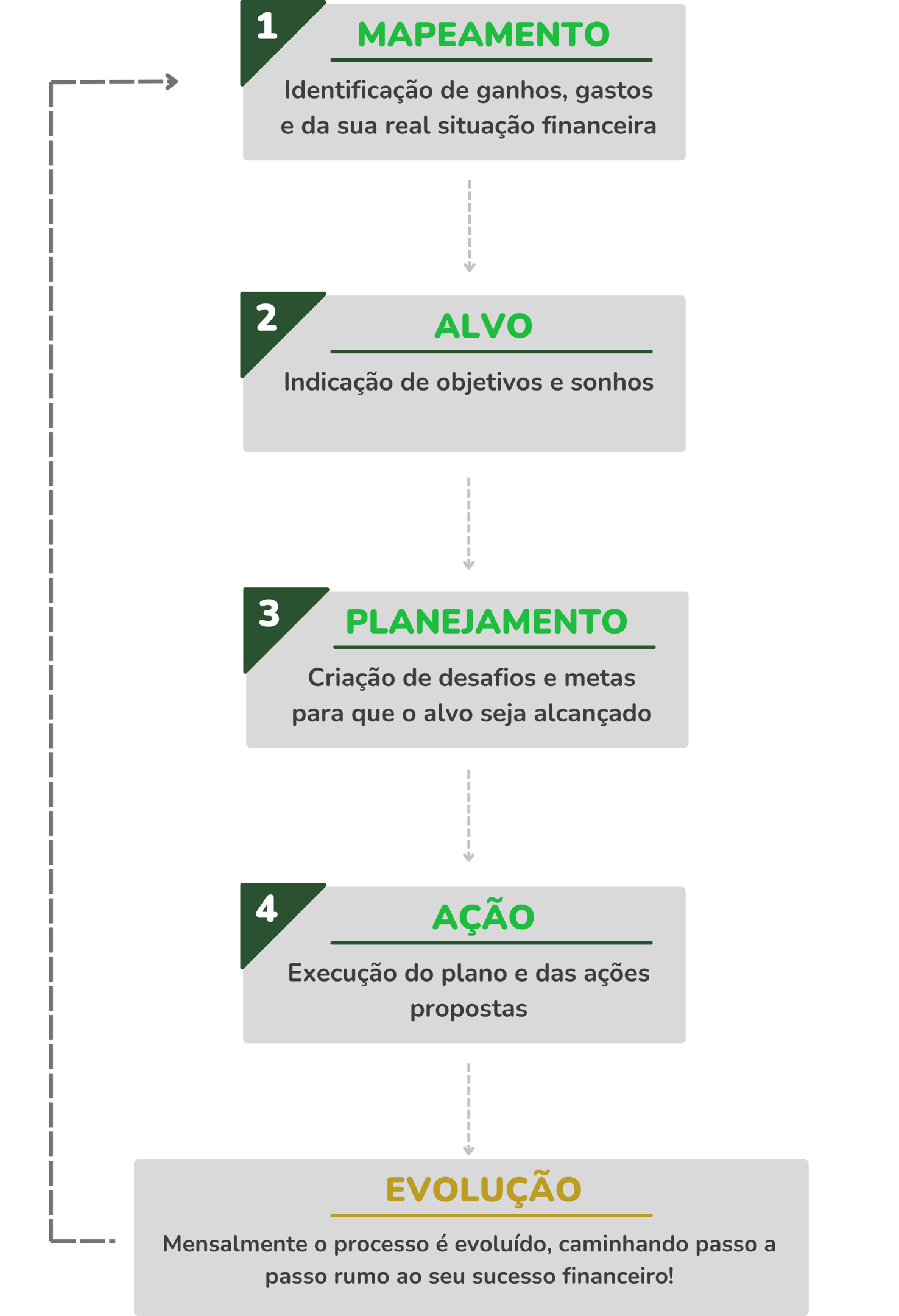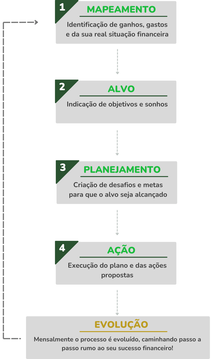 Nosso sistema coloca você no controle, incentivando uma mentalidade ativa no gerenciamento de suas finanças, focando em resultados e no alcance dos seu sonhos.
